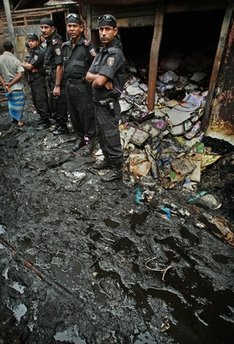 6月4日,孟加拉國安全官員維護(hù)火災(zāi)現(xiàn)場(chǎng)秩序